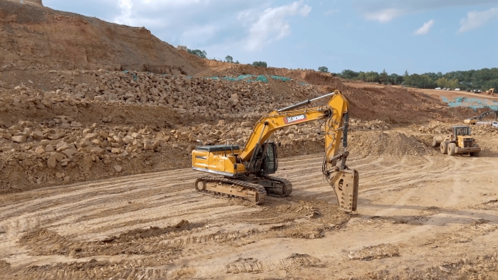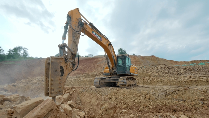該設備搭載的低速大扭矩發(fā)動機與大排量主泵協(xié)同發(fā)力,15100J的超大沖擊力輕松解體圍巖巨石,破碎后的骨料直接用于站區(qū)圍擋澆筑填充,實現(xiàn)資源閉環(huán)利用。