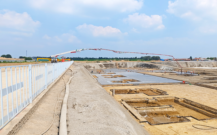 近日,在山東陵城某物流園建設(shè)現(xiàn)場,徐工72米泵車憑借卓越性能成為施工主力。