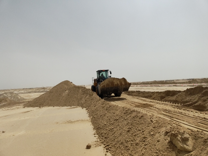 當(dāng)?shù)亟鸸忾W耀的沙漠地帶是極具標(biāo)志性的景觀,數(shù)臺(tái)徐工ZL50GN裝載機(jī)正在其中緊張作業(yè)。擔(dān)負(fù)起土方搬運(yùn)、路基平整、材料裝卸等關(guān)鍵任務(wù),在高溫、多塵的惡劣環(huán)境下依然表現(xiàn)出眾,成為不可或缺的重要力量。