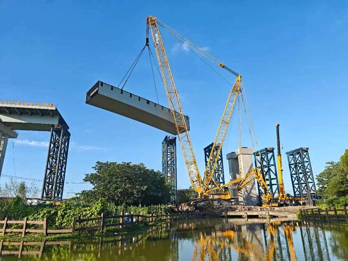 施工現(xiàn)場(chǎng),XGC11000以66米超起主臂工況擔(dān)當(dāng)主吊,成功將11段預(yù)制節(jié)段梁全部精準(zhǔn)就位,其中最重段達(dá)270噸,尺寸為45米×8米。