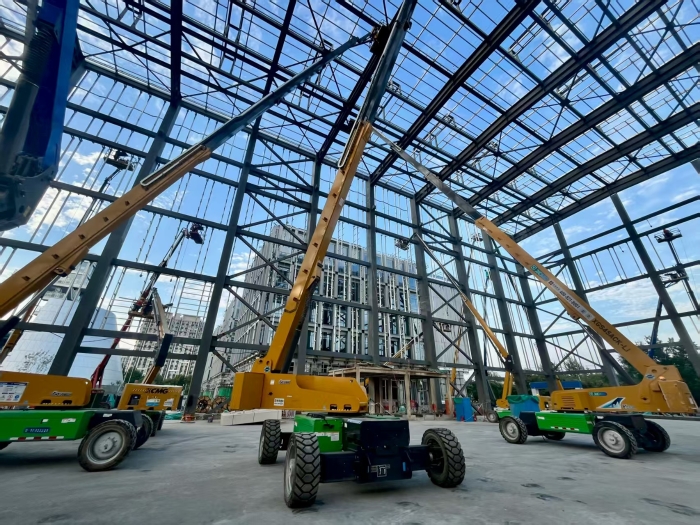 多臺設備組成的"綠色戰(zhàn)隊"展現(xiàn)出強大的協(xié)同作業(yè)能力,其靈活的轉(zhuǎn)向模式和強大的通過性在密集的鋼構件中穿梭自如,大幅提升了焊接安裝的效率,為這項重點工程的順利推進提供了強有力的高空保障。