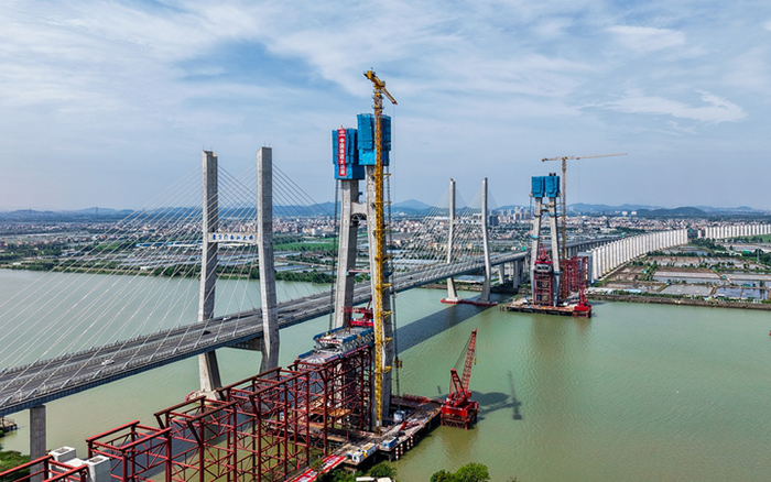 在深江鐵路重難點工程——跨磨刀門水道主橋施工現(xiàn)場,兩臺徐工XGT7527A-18S正穩(wěn)定吊裝,橫梁與對應(yīng)部位的塔柱同步施工,后續(xù)4臺施工升降機也將陸續(xù)入駐項目,共同助力主橋中、上塔柱爬升施工。