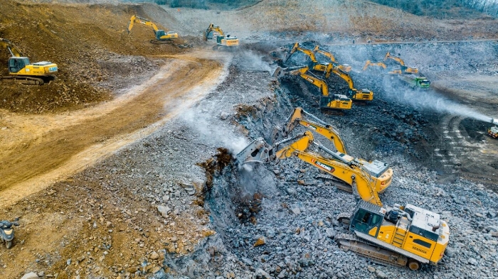 為確保工程節(jié)點,施工方經多輪方案論證,最終引入了14臺徐工挖掘機組成的主力設備集群,承擔核心的山體破碎及土石料裝車任務。在總量高達300萬方的工程面前,徐工XE650GK、XE380K、XE335GK等機型展現(xiàn)出強大的工況適應性。其中,8臺明星機型XE650GK配備215型破碎錘,憑借其獨有的破碎多級調頻控制技術,在面對高硬度玄武巖時日均破碎量穩(wěn)定在1500噸以上,同時將油耗控制在約40升/小時,實現(xiàn)了效率與節(jié)能的出色平衡。