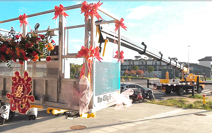 這輛 GKS45A 高空作業(yè)車剛完成交付,客戶便別出心裁地將其打造成婚車。車頭的 “囍” 字鮮艷奪目,車身纏繞的紅綢與花束將機(jī)械的硬朗感與婚禮的浪漫感巧妙融合。在喜慶的音樂與路人的祝福中,它行駛在婚車隊列之首,成為新人幸福旅程的 “硬核” 見證者。