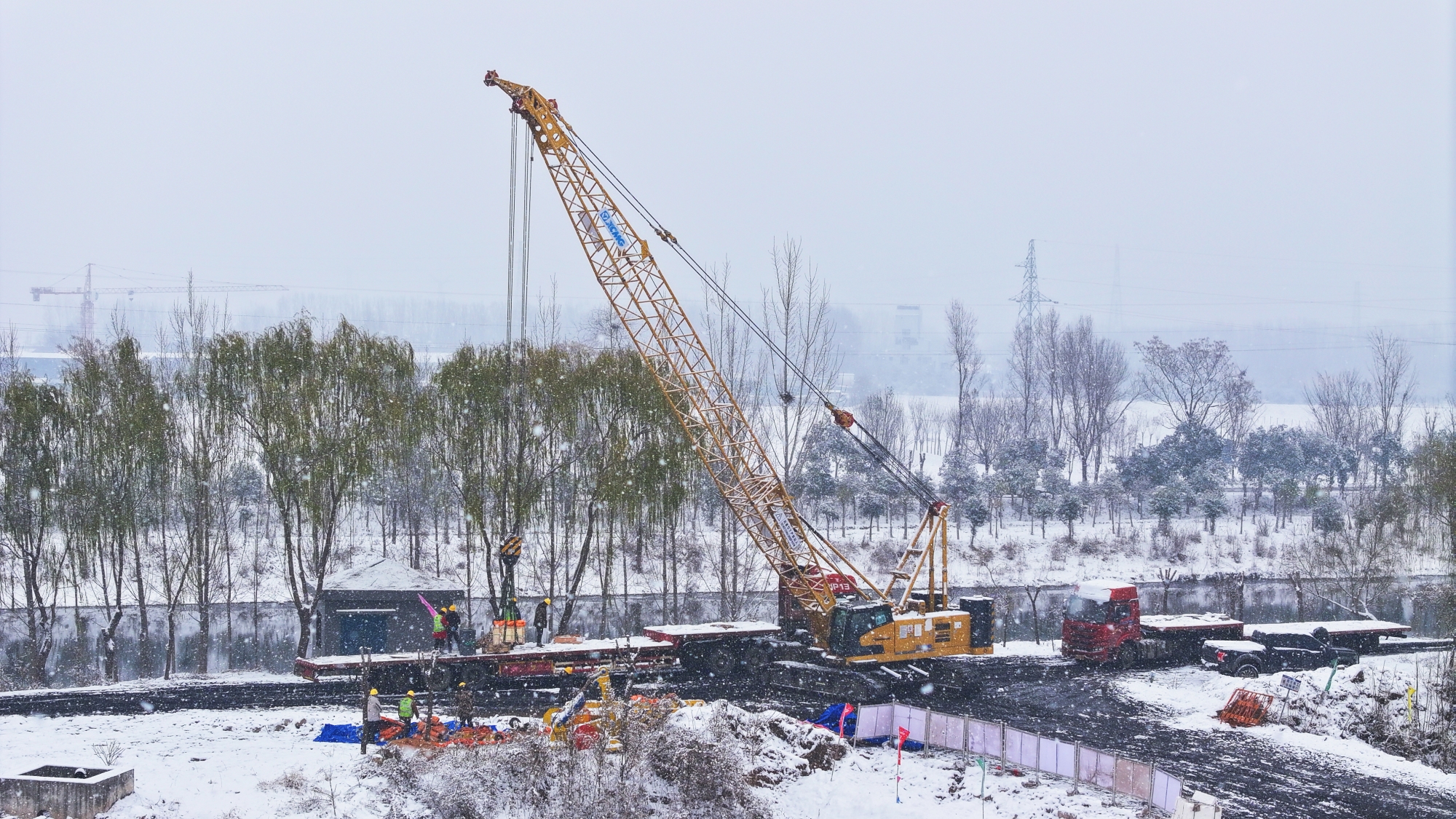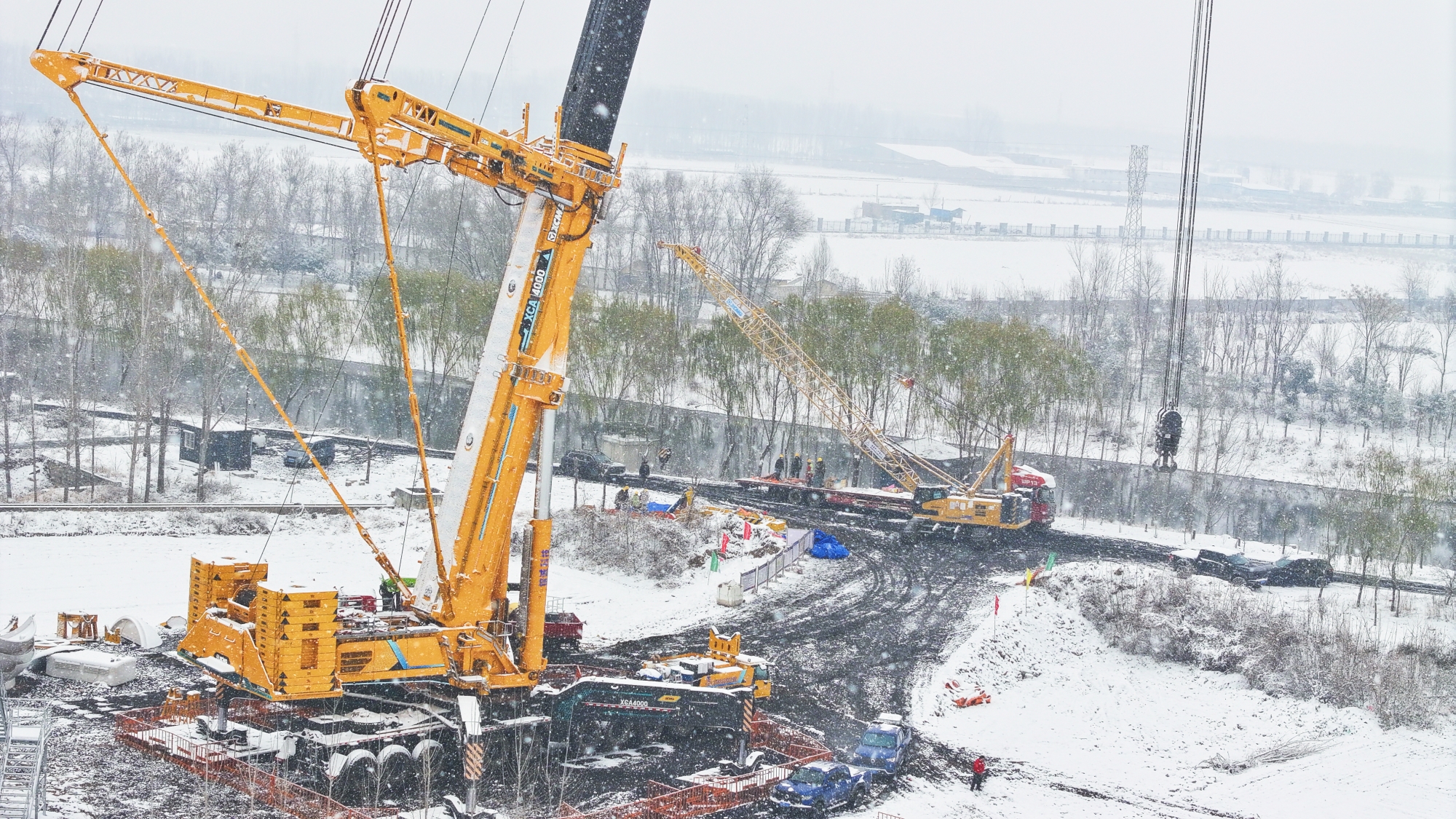 大雪紛飛,地面濕滑,吊裝作業(yè)面臨嚴峻考驗。XGC85投入作業(yè),高效配合“全球第一吊”XCA4000完成組裝任務(wù)。