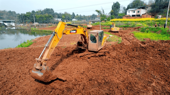 繼續(xù)向東,這里是萬(wàn)里長(zhǎng)江第一城——宜賓,在宜賓江安縣陽(yáng)春鎮(zhèn),5000畝高標(biāo)準(zhǔn)農(nóng)田建設(shè)進(jìn)入尾聲,項(xiàng)目高峰期投入30余臺(tái)徐工挖掘機(jī)。