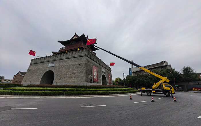 從設(shè)備就位到首面國旗掛好,施工迅速完成。過往市民紛紛駐足拍照,文昌閣周邊的節(jié)日氛圍隨國旗懸掛愈發(fā)濃厚。多重安全保障與高效作業(yè)能力,讓 “中國紅” 在古建筑旁莊重飄揚,也讓愛國情懷隨秋風傳遞街巷!