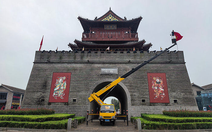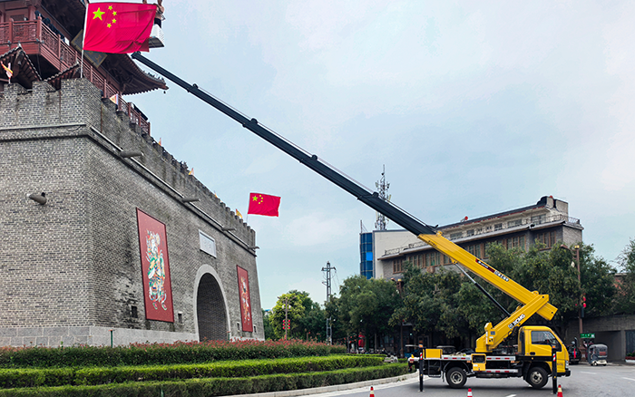 狹窄場地里,設(shè)備優(yōu)勢更顯突出。大跨距支腿快速撐開,軟腿檢測系統(tǒng)實時發(fā)出安全預警,上下車互鎖裝置筑牢多重安全防線。無線遙控器支持操作員地面把控全局,毫米級微調(diào)確保每面國旗懸掛角度絲毫不差。