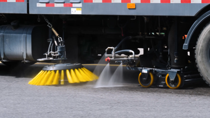 產(chǎn)業(yè)區(qū)周邊道路:運(yùn)輸車輛頻繁出入,易產(chǎn)生碎屑、油污。洗掃車搭載的高壓水槍與V型噴桿,可對(duì)路面進(jìn)行深度沖洗,油污去除率超95%,避免二次污染。